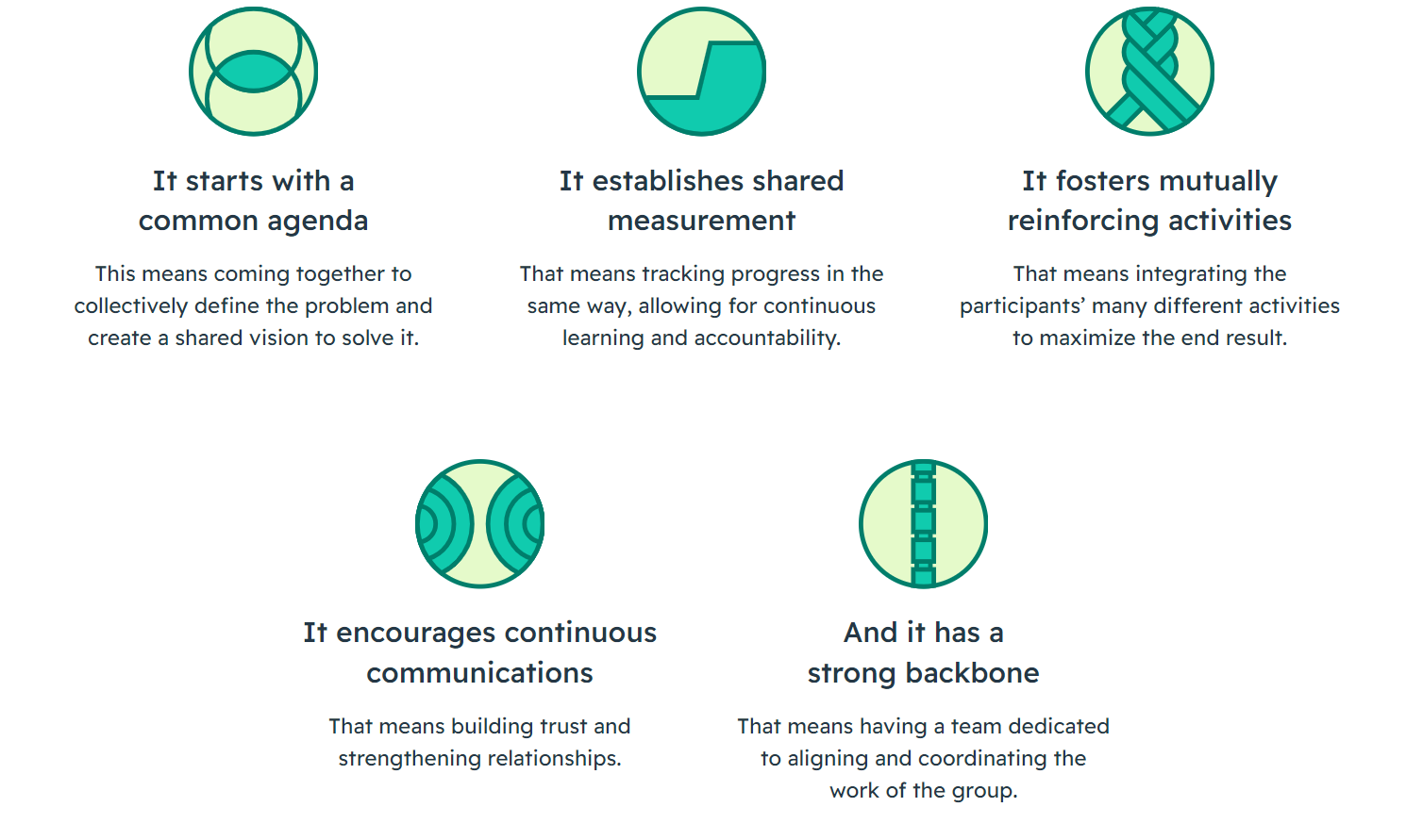 The five conditions of collective impact and five equity strategies by the The Collective Impact Forum (their getting started page includes a robust set of associated tools and resources).